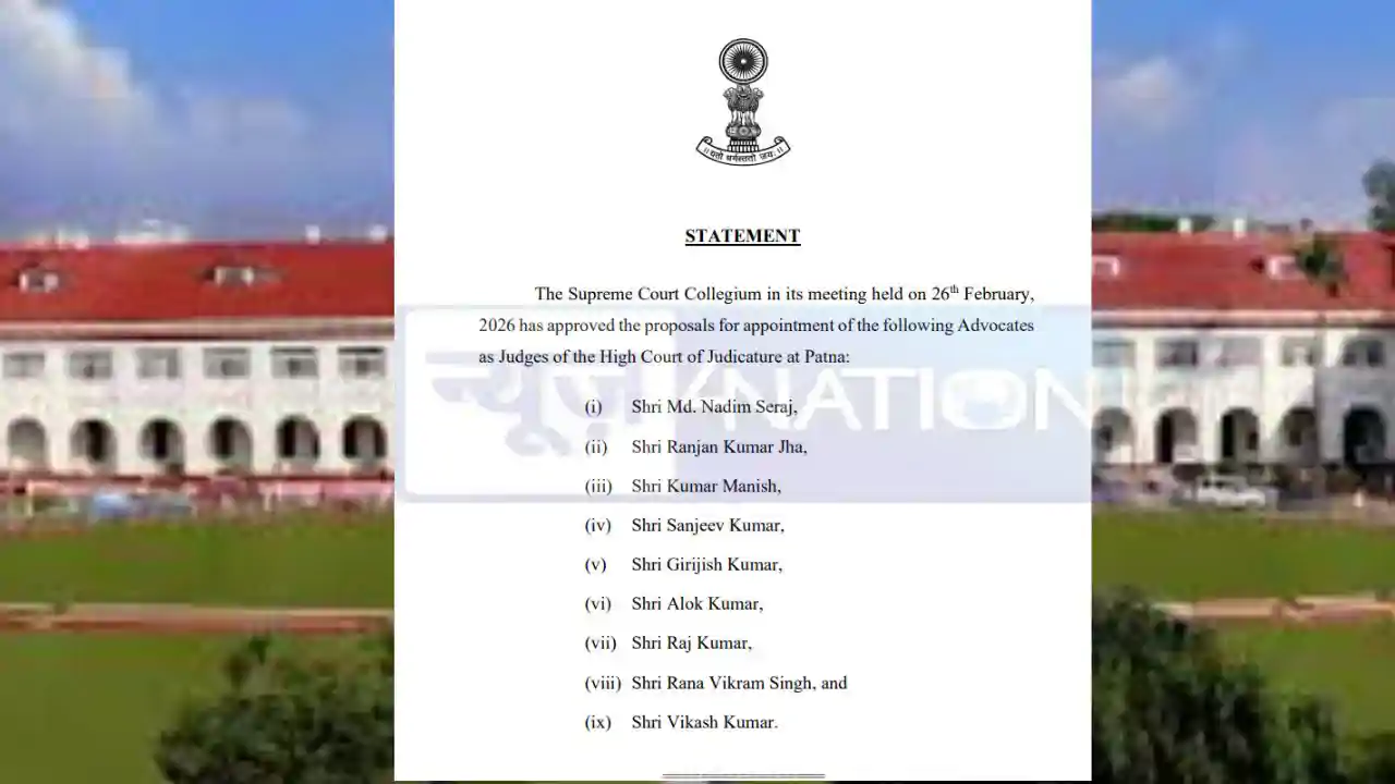 पटना हाईकोर्ट में जज बनाये जाने के लिए सुप्रीम कोर्ट कालेजियम ने पटना हाईकोर्ट के नौ अधिवक्ताओं की अनुशंसा की है।26 फरवरी,2026 सुप्रीम कोर्ट कालेजियम की बैठक में ये निर्णय लिया गया। इन अनुशंसित अधिवक्ताओं में मुहम्मद सिराज,रंजन कुमार झा, कुमार मनीष,संजीव कुमार, गिरिजेश कुमार, आलोक कुमार, राज कुमार,राणा विक्रम सिंह और विकास कुमार के नाम शामिल है।