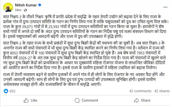 मुख्यमंत्री ने सोशल मीडिया प्लेटफॉर्म X पर पोस्ट कर साफ किया कि बिहार के कुल 39,073 गांवों में से अब तक 25,593 गांवों में दुग्ध उत्पादन समितियां बन चुकी हैं। बचे हुए गांवों में अगले दो वर्षों के भीतर समितियों के गठन का निर्देश पशु एवं मत्स्य संसाधन विभाग को दे दिया गया है। सत्ता के गलियारों में इसे डेयरी सेक्टर के जरिए ग्रामीण वोट बैंक को साधने की रणनीति के तौर पर देखा जा रहा है।