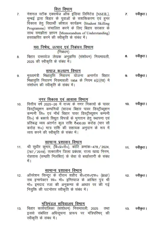 इससे पहले 25 नवंबर को बिहार कैबिनेट की बैठक हुई थी. इस बैठक में 6 एजेंडों पर मुहर लगी थी. उस वक्त बिहार के युवाओं के लिये बड़ा फैसला लिया गया था.