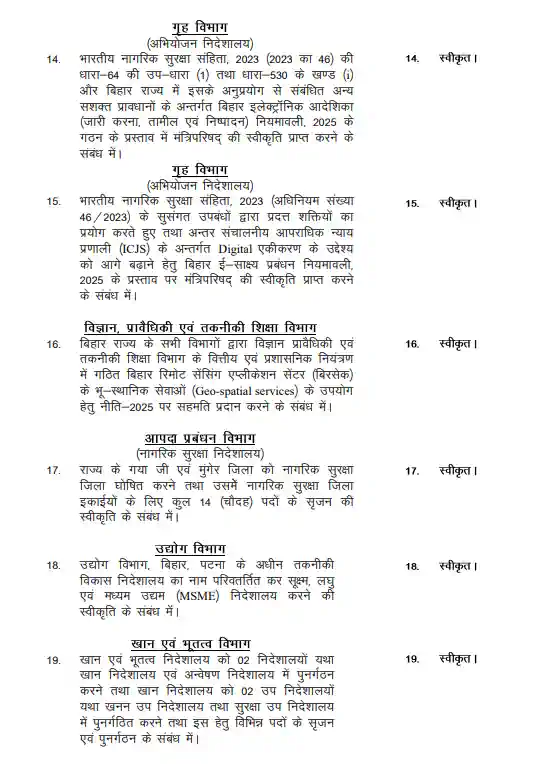 Bihar Cabinet Meeting: नीतीश कैबिनेट की बैठक में मुख्यमंत्री नीतीश कुमार की अध्यक्षता में 19 एजेंडों पर मुहर लगी. बिहार में रोजगार सृजन, कौशल विकास, और उद्यमिता को आगे बढ़ाने में अहम भूमिका निभाने में इन एजेंडों की स्वीकृति बेहद अहम मानी जा रही है.
