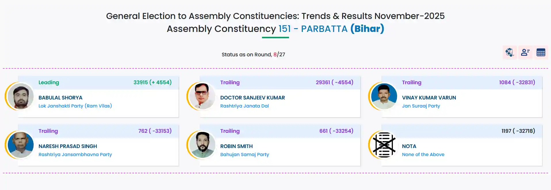 लेकिन जनता ने उनके दावे को गलत साबित कर दिया है। राजद के टिकट पर चुनाव लड़ रहे डा. संजीव कुमार परबत्ता सीट से पिछड़ते नजर आ रहे हैं। यहां लोजपा रामविलास के प्रत्याशी बाबूलाल शौर्य ने 8 राउंड के वोटों की गिनती के बाद बड़ी बढ़त बना ली है।