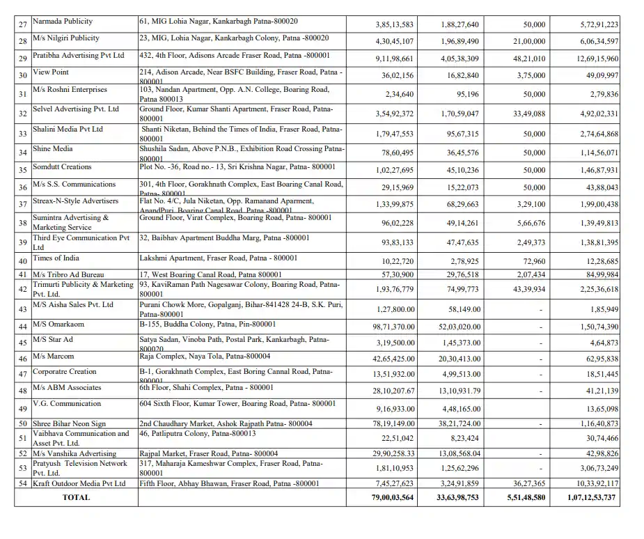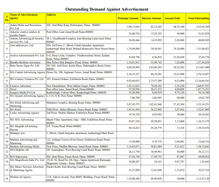 बकाएदारों की इस सूची में Pratibha Advertising Pvt Ltd सबसे ऊपर है, जिस पर सर्वाधिक 12.69 करोड़ रुपये का बकाया है । इसके बाद M/s Century Ventures Pvt. Ltd का नाम आता है, जिसकी देनदारी 12.24 करोड़ रुपये से अधिक की है । इसके अलावा Kraft Outdoor Media Pvt Ltd पर 10.33 करोड़ रुपये और Brite Neons Signs Pvt. Ltd पर 6.14 करोड़ रुपये की राशि बकाया दर्ज की गई है । ये सभी एजेंसियां पटना के प्रमुख व्यापारिक क्षेत्रों जैसे फ्रेजर रोड और डाकबंगला रोड से संचालित होती हैं ।