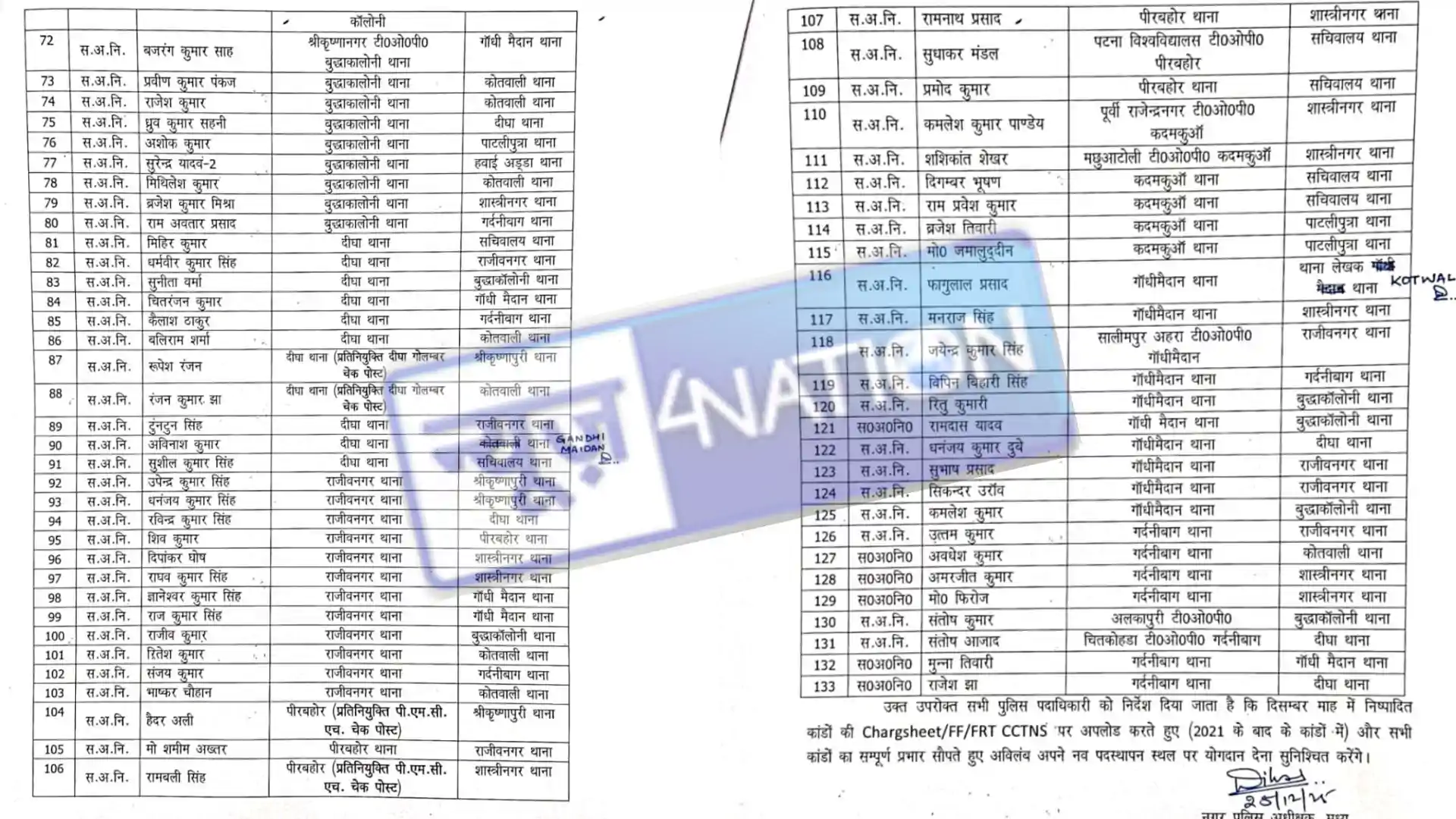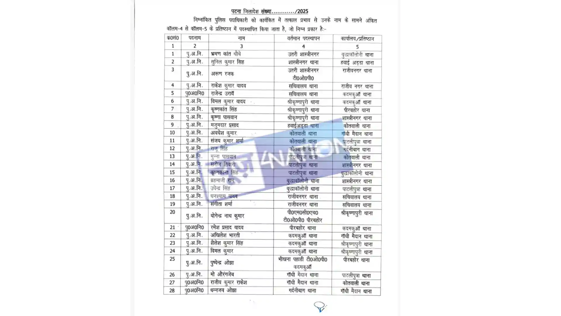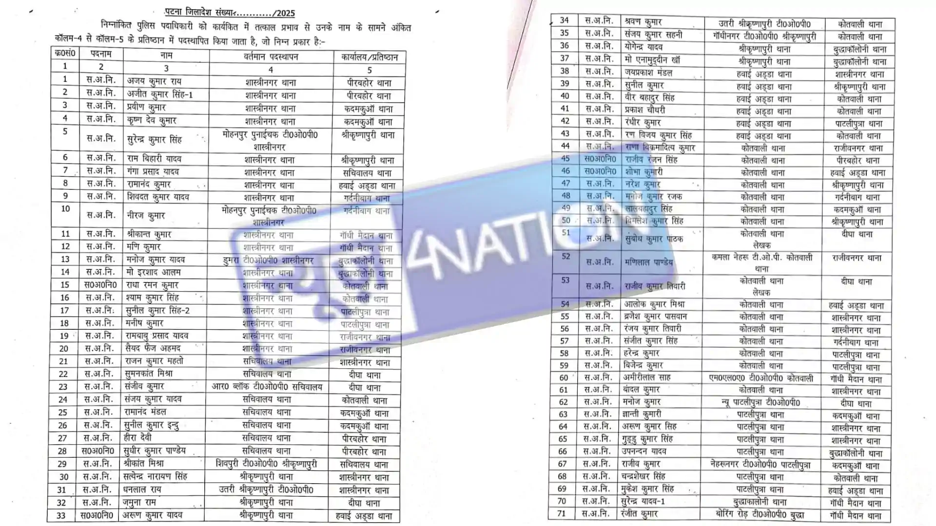पटना के वरिष्ठ पुलिस अधीक्षक (SSP) के निर्देश पर जिले में तैनात सब-इंस्पेक्टर (दरोगा) और असिस्टेंट सब-इंस्पेक्टर (ASI) स्तर के अधिकारियों का बड़े पैमाने पर तबादला किया गया है। इस कार्रवाई के तहत जिले के विभिन्न थानों और पुलिस चौकियों में तैनात अधिकारियों को नई जिम्मेदारियां सौंपी गई हैं। यह कदम पुलिसिंग में ताजगी लाने और लंबे समय से एक ही स्थान पर जमे अधिकारियों के कार्यक्षेत्र में बदलाव के उद्देश्य से उठाया गया है। कानून-व्यवस्था को और अधिक चुस्त-दुरुस्त बनाने के उद्देश्य से लगभग 150 संख्या में सब-इंस्पेक्टर (दरोगा) और असिस्टेंट सब-इंस्पेक्टर (ASI) का स्थानांतरण किया गया है।