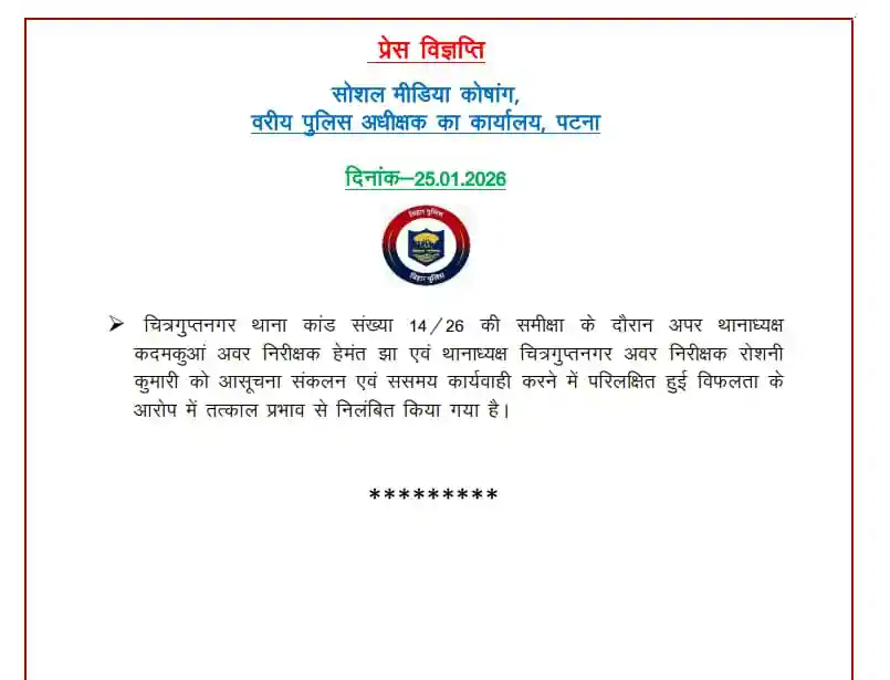 Shambhu Girls Hostel:थानाध्यक्ष चित्रगुप्तनगर रोशनी कुमारी के साथ 2 पुलिस अधिकारी सस्पेंड, भारी छीछालेदर के बाद पटना नीट छात्रा रेप मामले में हुआ एक्शन,अंडरगार्मेंट्स पर मिले स्पर्म के बाद खाकी की हुई है फजीहत