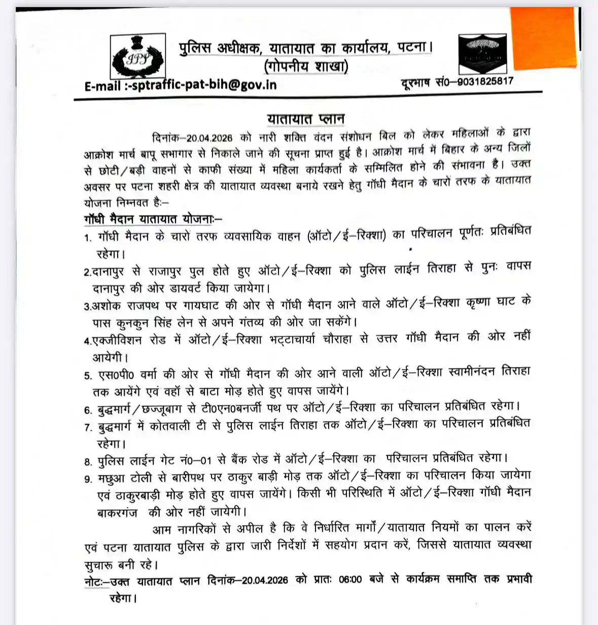 दरअसल, आज यानी 20 अप्रैल को नारी शक्ति वंदन संशोधन बिल के विरोध में महिला आक्रोश मार्च प्रस्तावित है। जिसके कारण पटना में व्यापक यातायात व्यवस्था लागू की गई है। महिला आक्रोश मार्च बापू सभागार से निकाला जाएगा, जिसमें राज्य के विभिन्न जिलों से बड़ी संख्या में महिला कार्यकर्ताओं के शामिल होने की संभावना है। इसे देखते हुए प्रशासन ने गांधी मैदान और आसपास के इलाकों में विशेष ट्रैफिक प्लान जारी किया है।