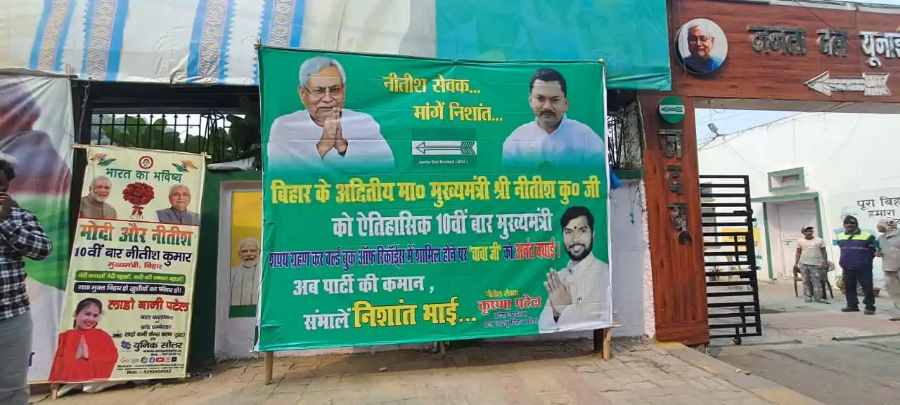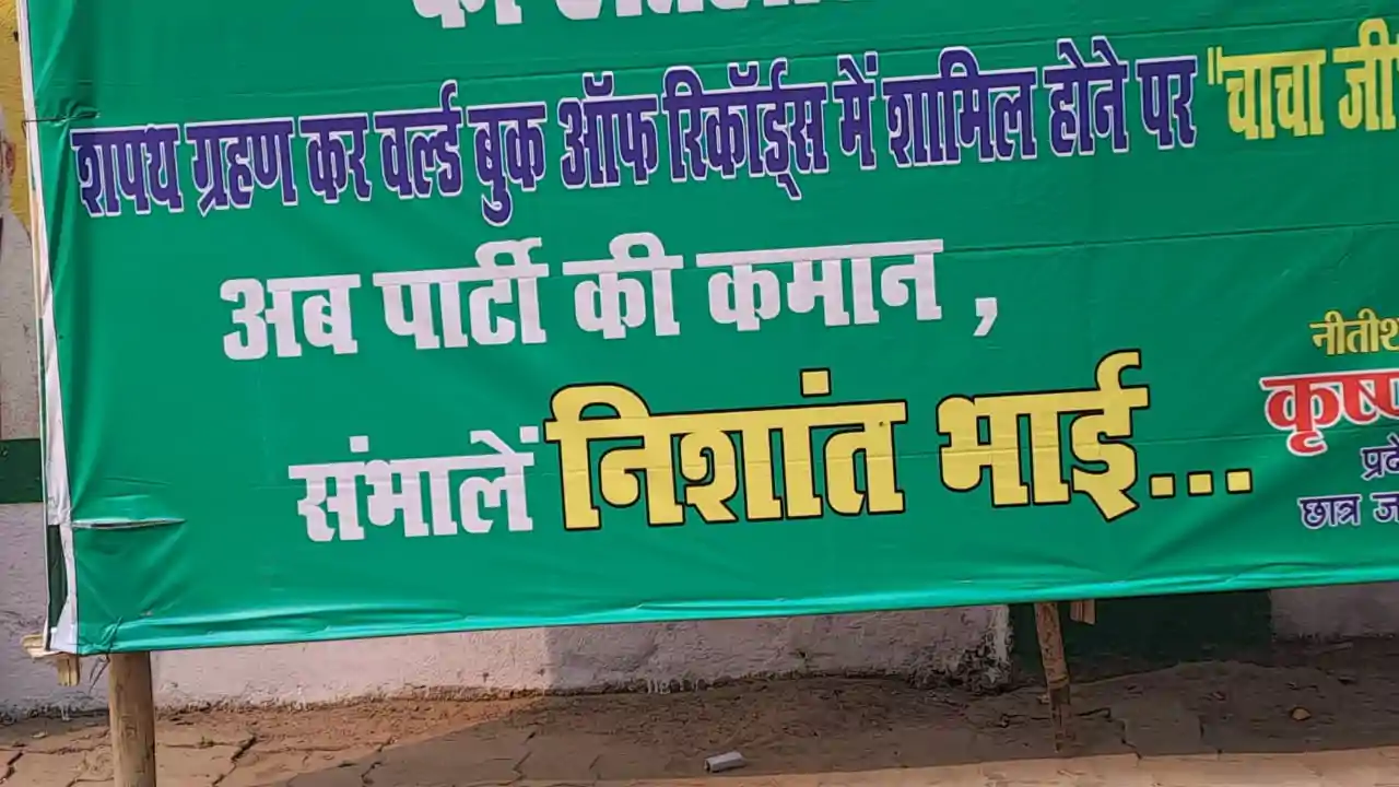 Bihar politics: पटना की सड़कों और जदयू दफ्तर के बाहर मुख्यमंत्री नीतीश कुमार और उनके बेटे निशांत कुमार के पोस्टर्स लगाए गए हैं, जिन पर यह लिखा गया है कि "नीतीश सेवक... मांगे निशांत... अब पार्टी की कमान संभालेंगे निशांत भाई।"...