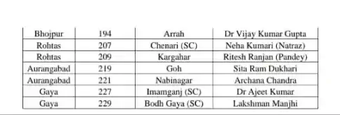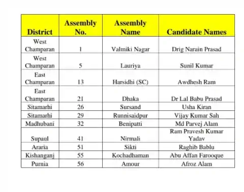 टिकट उम्मीदवारों की लिस्ट जारी करते हुए आरसीपी सिंह ने हमलोग नया इतिहास बनाने जा रहे हैं। जिन कैंडिडेट को टिकट मिला है, उनमें भारत रत्न कर्पूरी ठाकुर की पोती जागृति ठाकुर को मोरवा से टिकट मिला है। जबकि आरपी सिंह की बेटी लता सिंह को अस्थांवा से टिकट मिला है। वहीं भोजपुरी गायक रितेश पांडेय को करगहर से टिकट मिला है।