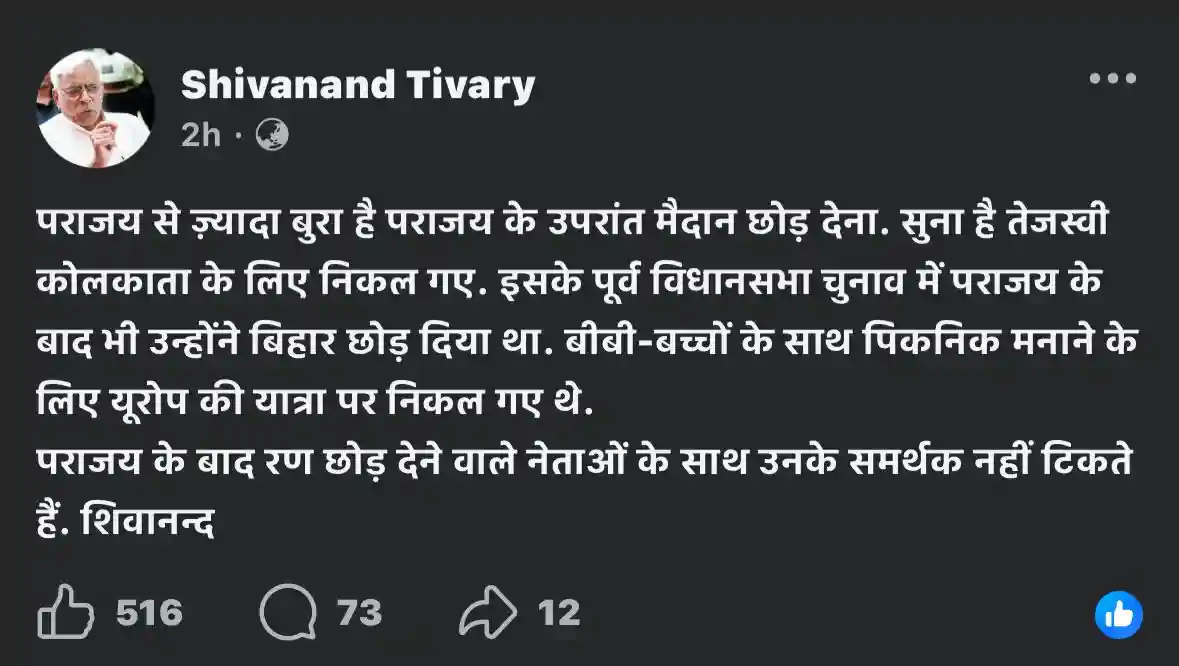 दरअसल, शिवानंद तिवारी ने अपने सोशल मीडिया पर ट्विट कर कहा कि, "पराजय से ज़्यादा बुरा है पराजय के उपरांत मैदान छोड़ देना. सुना है तेजस्वी कोलकाता के लिए निकल गए। इसके पूर्व विधानसभा चुनाव में पराजय के बाद भी उन्होंने बिहार छोड़ दिया था। बीबी-बच्चों के साथ पिकनिक मनाने के लिए यूरोप की यात्रा पर निकल गए थे। पराजय के बाद रण छोड़ देने वाले नेताओं के साथ उनके समर्थक नहीं टिकते"।