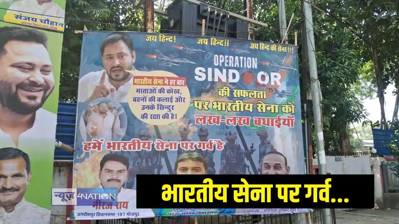 Operation Sindoor: भारत ने पहलगाम हमले में मारे गए 26 निर्दोषों के बलिदान का बदला पाकिस्तान पोषित आतंकी संगठनों के ठिकानों को तबाह कर लिया है। भारत ने मंगलवार की देर रात पाकिस्तान और पाक अधिकृत कश्मीर में मौजूद 9 आंतकी ठिकानों पर मिसाइल अटैक किया। भारतीय सशस्त्र बलों ने 9 आतंकी ठिकानों को नेस्तनाबूद कर दिया। इस कार्रवाई के बाद देशभर में उत्साह देखा जा रहा है। सत्ता पक्ष के साथ साथ विपक्ष के नेता भी भारतीय सेना को बधाई दे रहे हैं। भारतीय सेना पर गर्व कर रहे हैं। भारतीय सेना की कार्रवाई के बाद बिहार के नेता प्रतिपक्ष तेजस्वी यादव एक्टिव दिखे। तेजस्वी यादव ने आधी रात में ही सोशल मीडिया के माध्यम से भारतीय सेना को बधाई दी। वहीं आज राजद की ओर पूरे पटना में पोस्टर लगवा कर ऑपरेशन सिंदूर की सफलता पर भारतीय सेना को बधाई दी गई है।