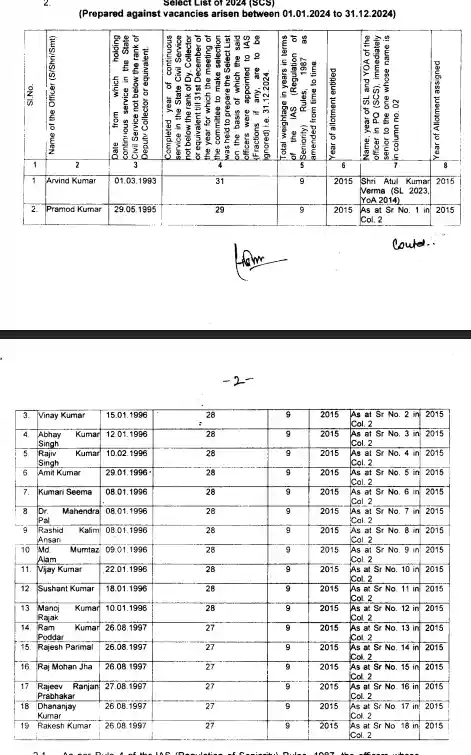 इस प्रक्रिया के तहत कई अधिकारियों को 2015 का आवंटन वर्ष सौंपा गया है, जिनमें अरविंद कुमार, प्रमोद कुमार, विनय कुमार, कुमार अभय सिंह, राजीव कुमार सिंह, अमित कुमार, कुमारी सीमा, डॉ. महेंद्र पाल, राशिद कलीम अंसारी, मो. मुमताज आलम, विजय कुमार, सुशांत कुमार, मनोज कुमार रजक, राम कुमार पोद्दार, राजेश परिमल, राज मोहन झा, राजीव रंजन प्रभाकर, धनंजय कुमार, और राकेश कुमार शामिल हैं । इनमें से कई अधिकारियों को उनकी 27 से 31 वर्ष की निरंतर सेवा (31.12.2024 तक) के लिए अधिकतम 9 वर्ष का भार दिया गया है, जिसके परिणामस्वरूप उन्हें आवंटन वर्ष 2015 प्राप्त हुआ है ।