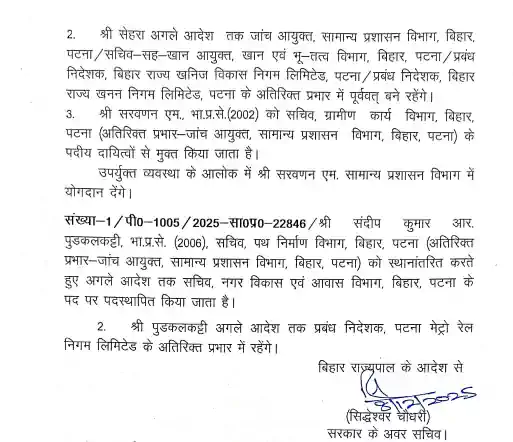 5. संदीप कुमार आर. पुडकलकट्टी (2006 बैच): पथ निर्माण विभाग के सचिव को स्थानांतरित कर नगर विकास एवं आवास विभाग का सचिव बनाया गया है. इसके अतिरिक्त उनके पास पटना मेट्रो रेल निगम लिमिटेड (PMRCL) के प्रबंध निदेशक (MD) का अतिरिक्त प्रभार भी रहेगा.