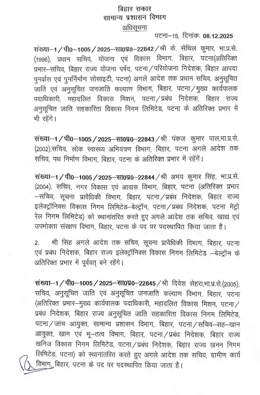 1. के. सेंथिल कुमार (1996 बैच): वर्तमान में योजना एवं विकास विभाग के प्रधान सचिव हैं। इन्हें अब प्रधान सचिव, अनुसूचित जाति एवं अनुसूचित जनजाति कल्याण विभाग का अतिरिक्त प्रभार (Additional Charge) दिया गया है. इसके साथ ही वे महादलित विकास मिशन के CEO और बिहार राज्य अनुसूचित जाति सहकारिता विकास निगम के MD का भी काम देखेंगे.