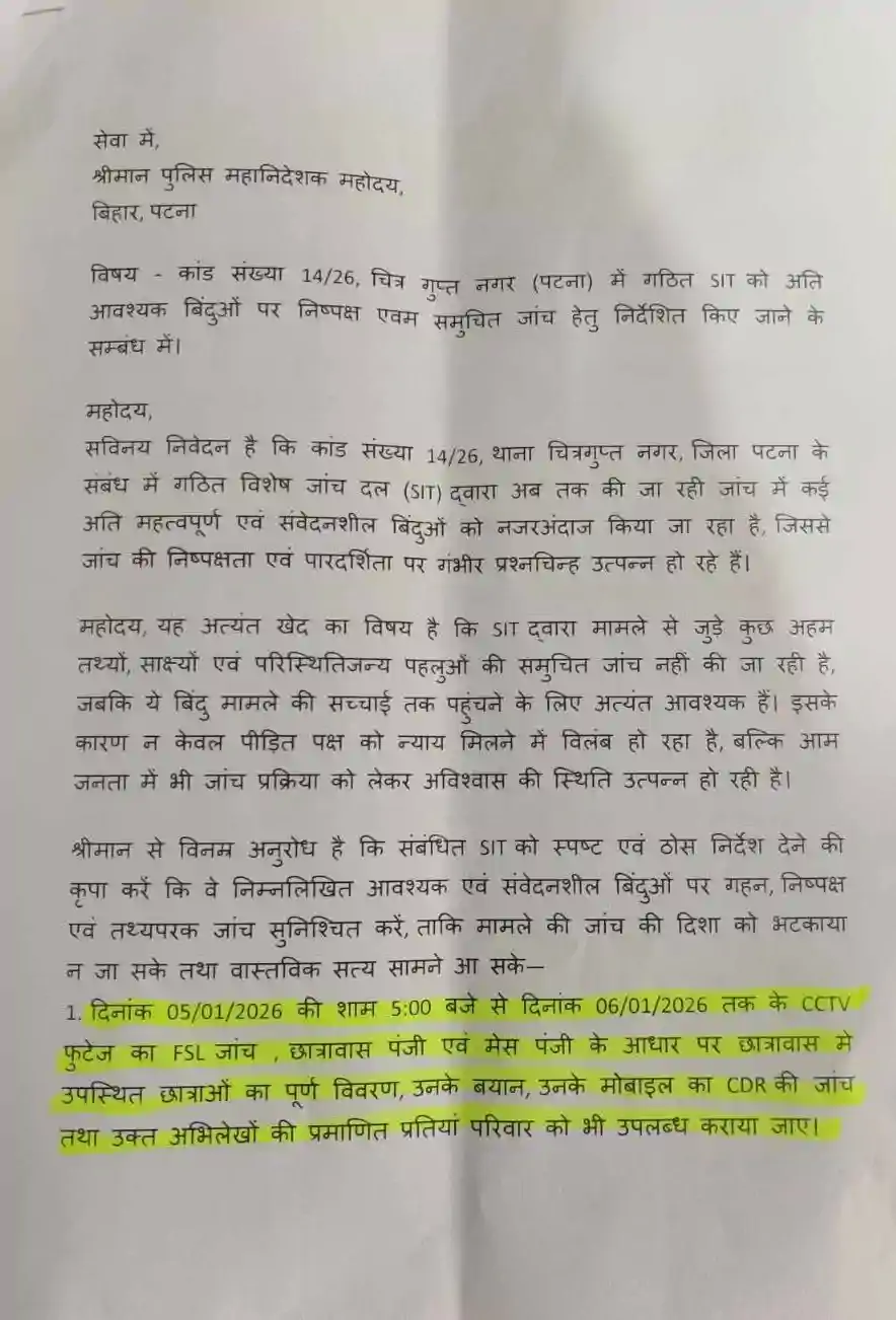 दूसरे बिंदु में छात्रावास के मकान मालिक मनीष रंजन के पिछले दरवाजे, आसपास की गलियों और सड़कों के सीसीटीवी फुटेज की एफएसएल जांच के साथ-साथ मनीष रंजन और उनके बेटे के मोबाइल CDR की जांच की मांग की गई है। तीसरे बिंदु में छात्रावास संचालिका नीलम अग्रवाल, उनके पति श्रवण अग्रवाल और बेटे आशु अग्रवाल के मोबाइल रिकॉर्ड खंगालने की मांग रखी गई है।