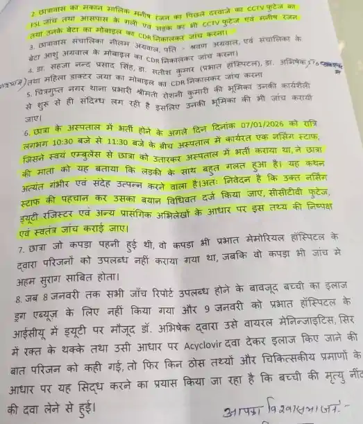 एक बेहद गंभीर आरोप अस्पताल के एक नर्सिंग स्टाफ से जुड़ा है, जिसने भर्ती के दौरान छात्रा की मां से कहा था कि “लड़की के साथ बहुत गलत हुआ है।” परिजन चाहते हैं कि उस नर्स की पहचान कर उसका बयान, सीसीटीवी फुटेज और ड्यूटी रजिस्टर के आधार पर निष्पक्ष जांच कराई जाए।