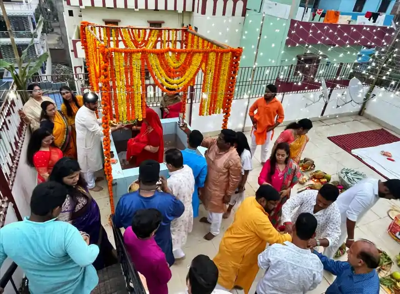 गंगा नदी के किनारे बने छठ घाटों पर हर साल लाखों की संख्या में श्रद्धालु जुटते हैं, जिससे भीड़ और सुरक्षा का दबाव बढ़ जाता है। इसी समस्या से निपटने के लिए, खासकर शहरी क्षेत्रों के व्रतियों और उनके परिवारों ने अपने आवासों पर ही अस्थायी अर्घ्य स्थल तैयार किए।