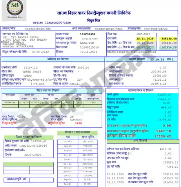 यह वही घर है, जहां तेजप्रताप का आना-जाना लगा रहता है, भले ही उनका रहन-सहन सरकारी आवास में होता हो। आखिरी बार उन्होंने 20 जुलाई 2022 को 1,04,799 रुपए जमा किए थे, उसके बाद से तीन वर्षों तक न पेमेंट हुआ, न कनेक्शन कटा जबकि नवंबर 2025 का बिजली बिल भी बाकायदा बता रहा है कि ऊर्जा बकाया 2,30,160 रुपए, विलंब शुल्क 23,681 रुपए, अन्य प्रभार 71,142 रुपए—कुल मिलाकर 3,24,974 रुपए का भारी-भरकम देनदाराना खाता।