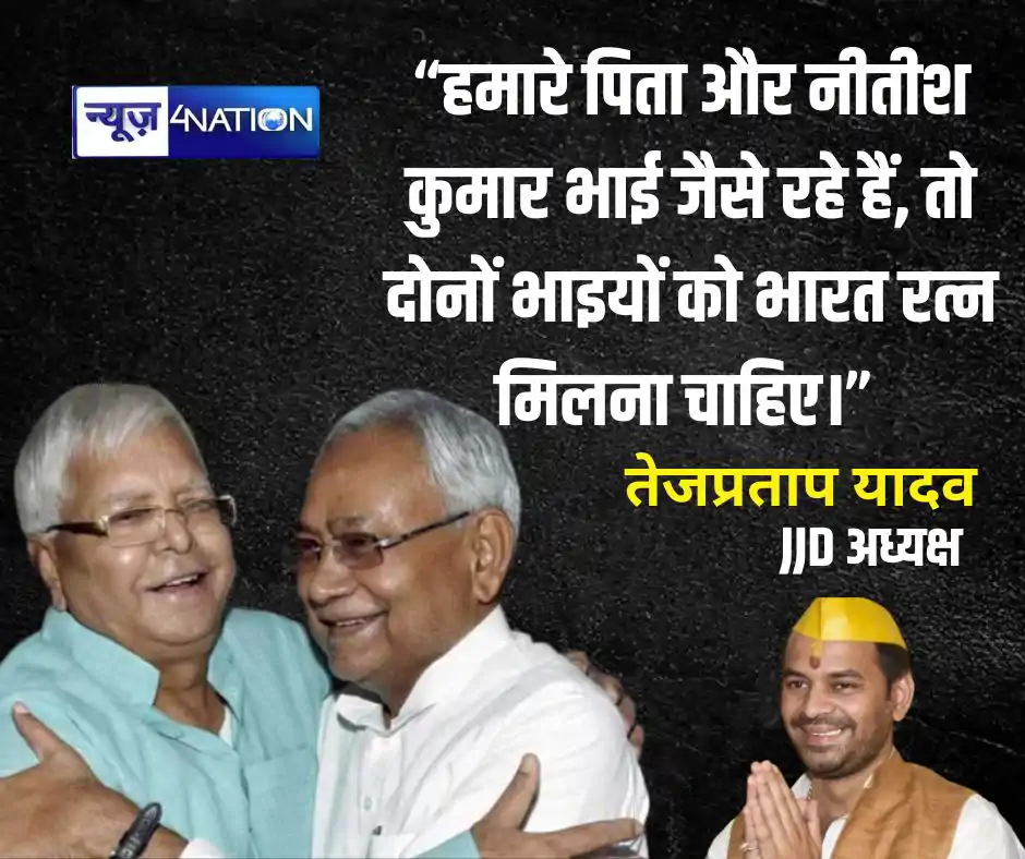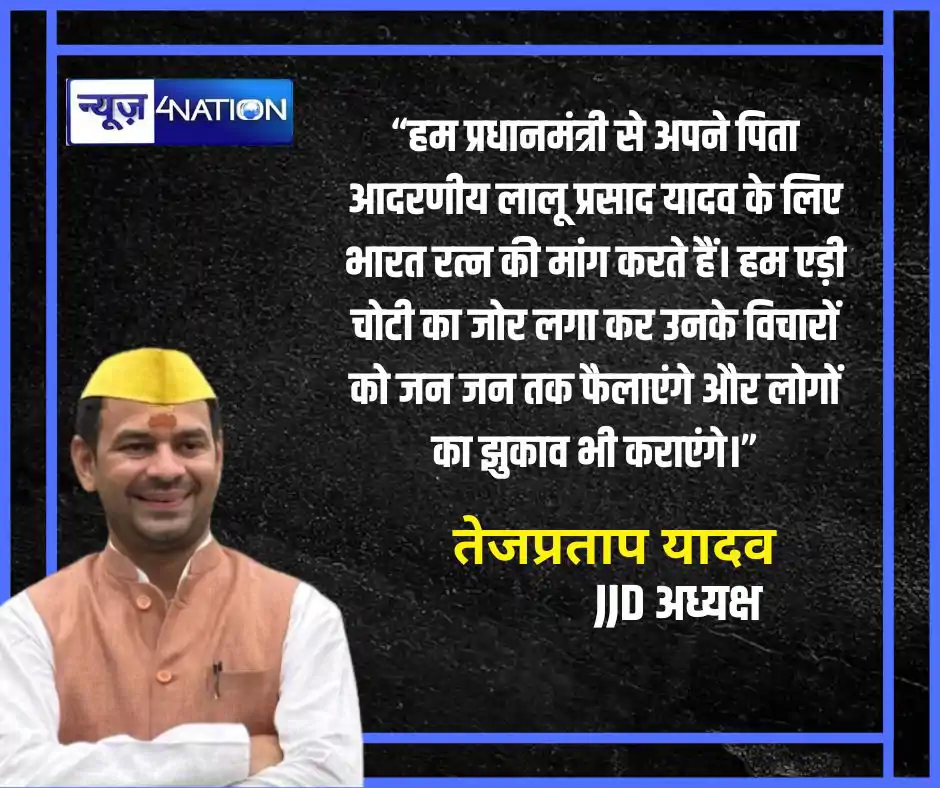जनशक्ति जनता दल के राष्ट्रीय अध्यक्ष तेज प्रताप यादव ने कहा कि, हम जनशक्ति जनता दल की तरफ से प्रधानमंत्री से मांग करते हैं कि जिस तरीके से जदयू के लोगों ने नीतीश जी के लिए भारत रत्न का मांग किया है, उसी तरीके से हम भी अपने पिता लालू प्रसाद यादव के लिए भारत रत्न की मांग करते हैं।
