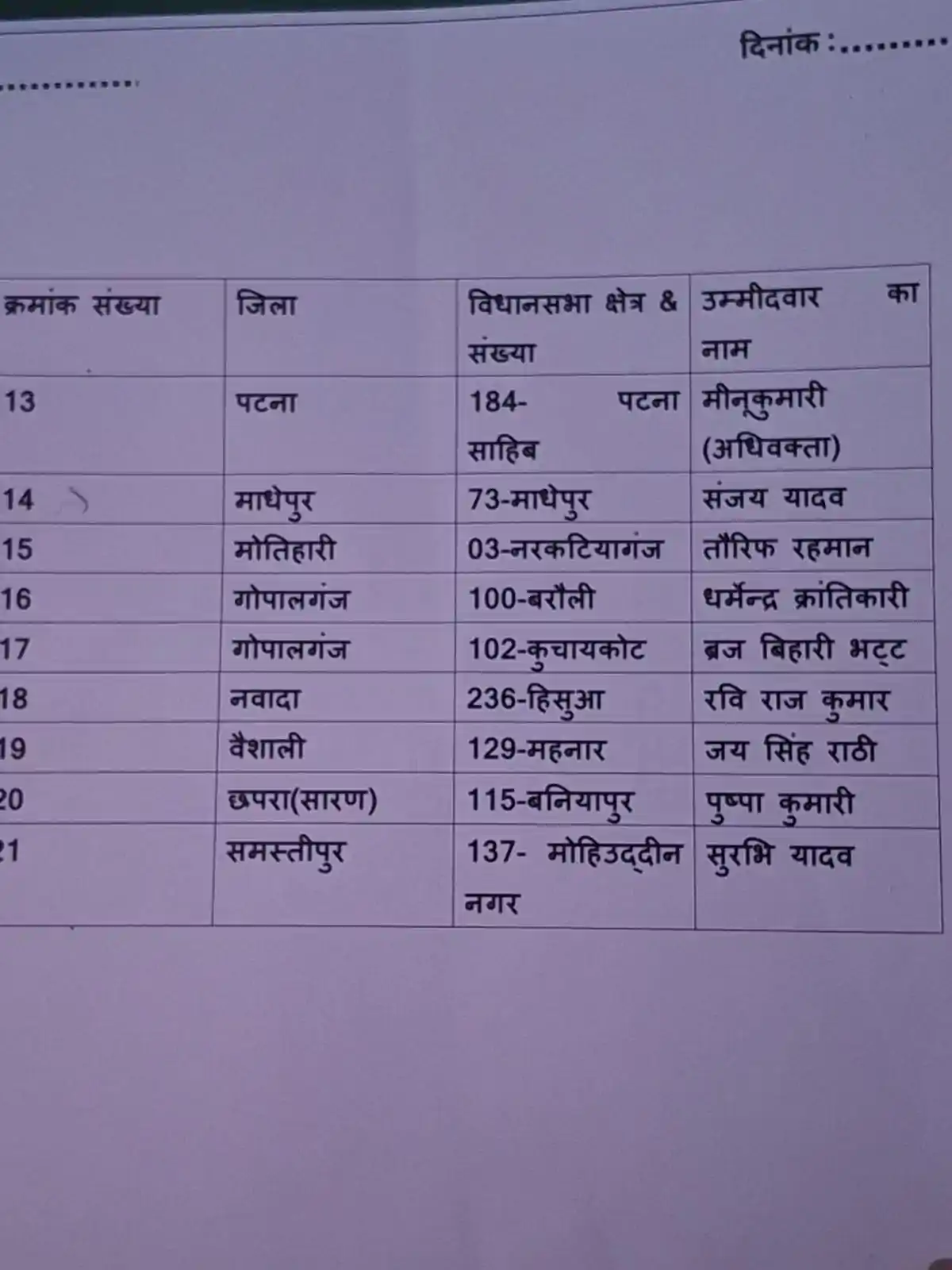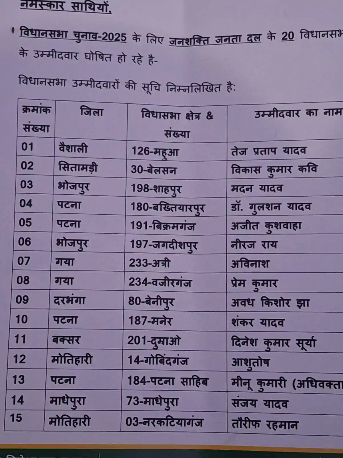 Patna - राजद और लालू परिवार से अलग होने के बाद तेज प्रताप यादव अपनी नई पार्टी जनशक्ति जनता दल के साथ विधानसभा चुनाव लड़ने जा रहे हैं। जहां राजद और महागठबंधन में शामिल पार्टियों ने अभी तक कैंडिंडेट की घोषणा नहीं की है। वहीं तेजप्रताप ने अपने उम्मीदवारों की पहली लिस्ट जारी कर दी है। पहली लिस्ट में तेज प्रताप ने अपने नाम के साथ 21 सीटों के लिए कैंडिडेट घोषित किए हैं।