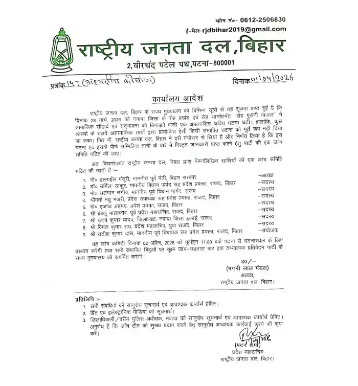 Bihar News:बिहार की सियासत में नवादा की घटना ने सियासी तापमान को अचानक तेज कर दिया है। रोह में 28 मार्च को हुई सामाजिक सौहार्द बिगाड़ने वाली वारदात पर राष्ट्रीय जनता दल ने सख्त रुख अपनाते हुए सीधे प्रशासन को कटघरे में खड़ा कर दिया है। पार्टी के राष्ट्रीय कार्यकारी अध्यक्ष तेजस्वी प्रसाद यादव और प्रदेश अध्यक्ष मंगनी लाल मंडल ने इस पूरे मामले को बेहद गंभीर मानते हुए जांच कमेटी गठित की।