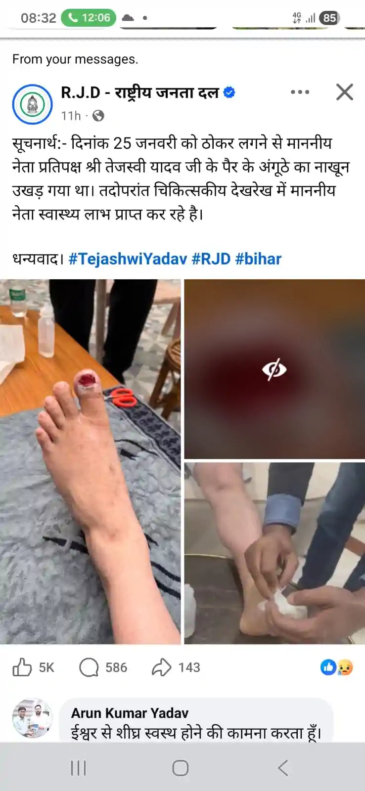 Bihar Politics: बिहार विधानमंडल के बजट सत्र में शामिल नहीं होंगे तेजस्वी? बड़े हादसे के हुए शिकार, पैर का नाखुन उखड़ा