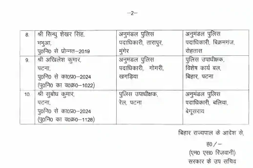 बिहार पुलिस सेवा के 10 अधिकारियों का तबादला करते हुए उनकी नई तैनाती के आदेश जारी कर दिए हैं । यह अधिसूचना (संख्या-2/पी01-20-04/2021 गृ०आ०- 463) दिनांक 09 जनवरी 2026 को जारी की गई है ।