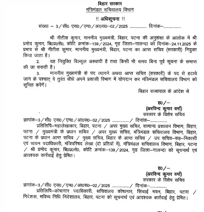 Patna - बिहार के मुख्यमंत्री नीतीश कुमार ने अपने सचिवालय में प्रशासनिक कसावट लाते हुए अपनी कोर टीम का विस्तार किया है। मंत्रिमंडल सचिवालय विभाग ने मुख्यमंत्री की अनुशंसा पर बिहार प्रशासनिक सेवा (बि०प्र०से०) के दो अधिकारियों को मुख्यमंत्री का आप्त सचिव (सरकारी) नियुक्त करने की अधिसूचना जारी कर दी है। सरकार के विशेष सचिव अरविन्द कुमार वर्मा के हस्ताक्षर से 26 नवंबर 2025 को यह आदेश जारी किया गया है ।
