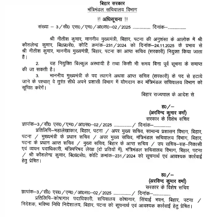 उन्हें 24 नवंबर 2025 के प्रभाव से मुख्यमंत्री का आप्त सचिव नियुक्त किया गया है । वहीं, दूसरे आदेश के तहत बिहार प्रशासनिक सेवा के ही कौशलेन्द्र कुमार (कोटि क्रमांक-231/2024) को भी 24 नवंबर 2025 के प्रभाव से मुख्यमंत्री का आप्त सचिव (सरकारी) बनाया गया है ।