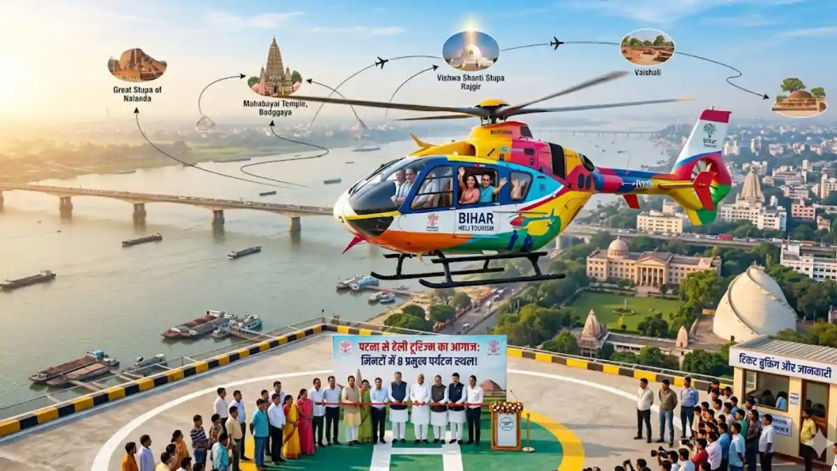 Bihar News:  बिहार के पर्यटन क्षेत्र में आज एक नए अध्याय की शुरुआत होने जा रही है। राजधानी पटना से अब 'हेली टूरिज्म' सेवा का आगाज़ हो रहा है, जिसके जरिए पर्यटक घंटों का सफर मिनटों में तय कर सकेंगे। इस सेवा के तहत बिहार के 8 प्रमुख पर्यटन स्थलों को जोड़ा गया है, जिससे देशी-विदेशी सैलानियों को राज्य की ऐतिहासिक धरोहरों को आसमान से निहारने का अनोखा अनुभव मिलेगा। हेली टूरिज्म सेवा से अब आप मिनटों में बिहार घूम सकेंगे।
