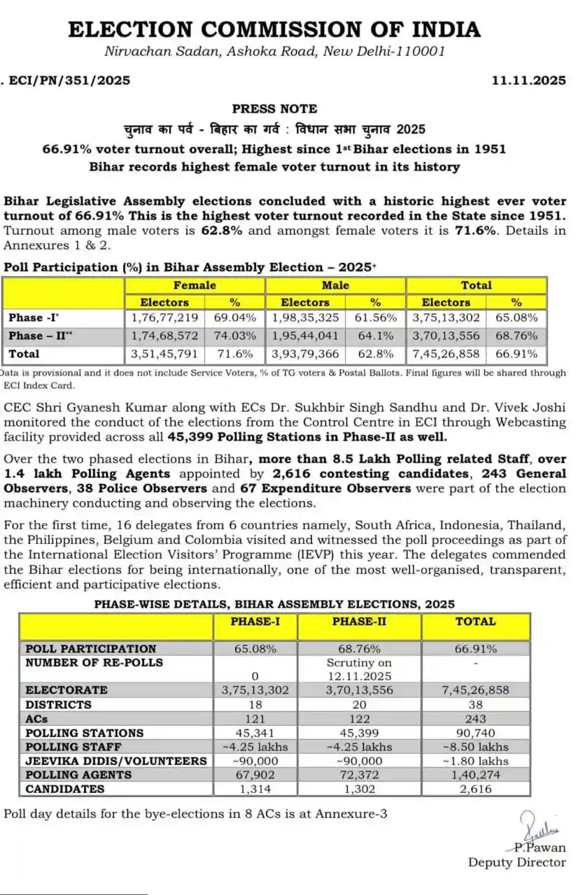 Patna : बिहार विधानसभा चुनाव 2025 ने इतिहास का सबसे ऊंचा मतदान प्रतिशत दर्ज किया है। बिहार निर्वाचन आयोग द्वारा जारी आंकड़ों के अनुसार, इस चुनाव में कुल 66.91% मतदाताओं ने अपने मताधिकार का प्रयोग किया। यह न केवल पिछले सभी विधानसभा चुनावों का रिकॉर्ड तोड़ता है, बल्कि राज्य में 1951 के बाद दर्ज किया गया अब तक का सर्वाधिक मतदान प्रतिशत है। सबसे महत्वपूर्ण बात यह है कि इस रिकॉर्ड तोड़ भागीदारी में महिला मतदाताओं की भूमिका निर्णायक रही है।