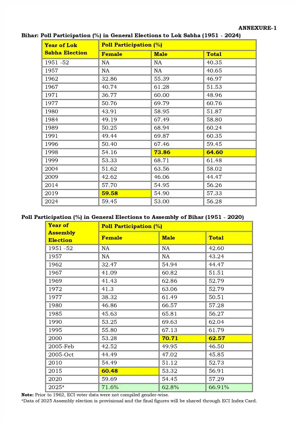 दूसरे चरण के मतदान के दौरान यह अंतर और भी स्पष्ट रूप से दिखा, जहाँ महिला भागीदारी 74.03% रही, जबकि पुरुष भागीदारी 64.1% थी। पहले चरण में भी महिला मतदाताओं (69.04%) ने पुरुष मतदाताओं (61.56%) से अधिक वोट डाले।