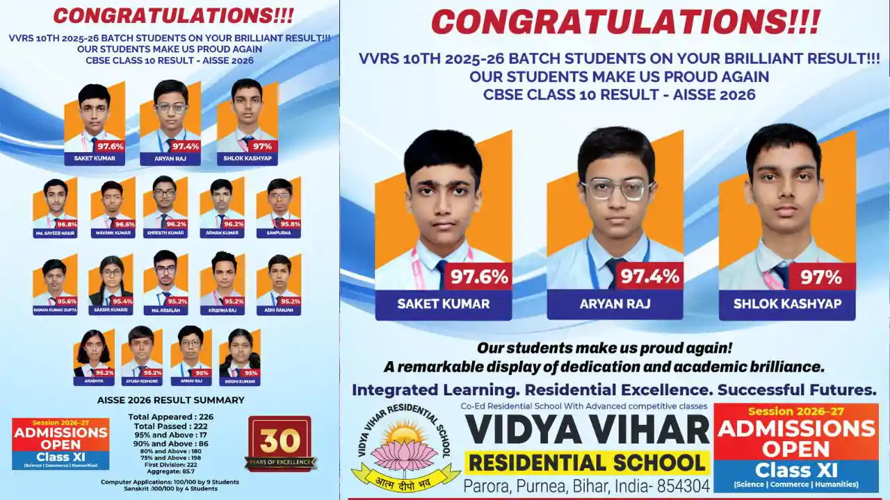 विद्या विहार आवासीय विद्यालय, पूर्णिया ने सीबीएसई कक्षा 10 (AISSE 2026) परीक्षा में एक बार फिर अपनी उत्कृष्ट शैक्षणिक परंपरा को कायम रखते हुए शानदार सफलता अर्जित की है।