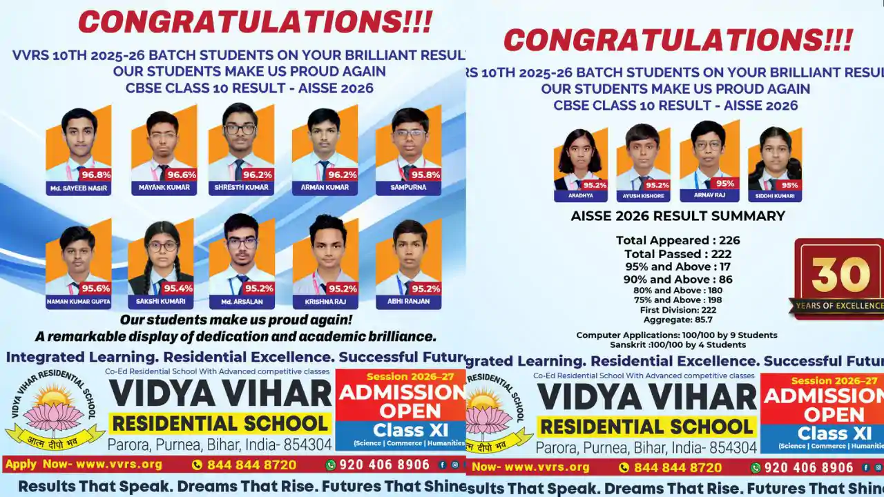 पूर्णिया : विद्या विहार आवासीय विद्यालय, पूर्णिया ने सीबीएसई कक्षा 10 (AISSE 2026) परीक्षा में एक बार फिर अपनी उत्कृष्ट शैक्षणिक परंपरा को कायम रखते हुए शानदार सफलता अर्जित की है। वर्ष 1996 से 2026 तक 30 वर्षों की गौरवशाली शैक्षणिक यात्रा को निरंतर आगे बढ़ाते हुए विद्यालय ने इस वर्ष भी उत्कृष्ट परिणाम प्रस्तुत कर अपनी शैक्षणिक गुणवत्ता, अनुशासन एवं समर्पित शिक्षण पद्धति का सशक्त परिचय दिया है। विद्यालय का कुल औसत (सर्वश्रेष्ठ 5) 85.7% रहा, जो विद्यार्थियों की मेहनत, शिक्षकों के मार्गदर्शन और संस्थान के सुव्यवस्थित शैक्षणिक वातावरण का प्रत्यक्ष प्रमाण है।