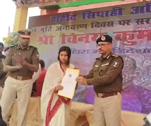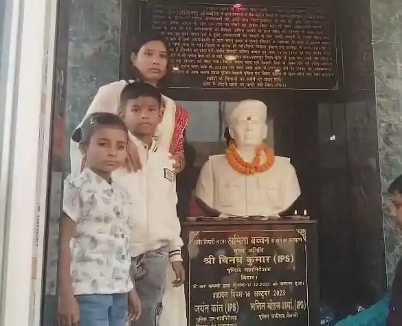 Hajipur - बैंक लूट के दौरान अदम्य साहस का परिचय देते हुए अपनी जान कुर्बान करने वाले शहीद जवान अमिताभ बच्चन की शहादत को बिहार पुलिस ने नमन किया। सराय थाना परिसर में आयोजित एक भावुक समारोह में बिहार पुलिस महानिदेशक (DGP) विनय कुमार ने शहीद जवान की आदमकद प्रतिमा का अनावरण किया। इस मौके पर उन्होंने शहीद की पत्नी को नियुक्ति पत्र सौंपा और विभाग की ओर से लगभग 43 लाख रुपये की अनुग्रह राशि प्रदान की।