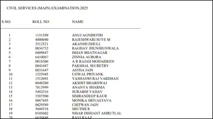 यूपीएससी द्वारा जारी टॉपर्स की सूची (Rank List) के अनुसार, अनुज अग्निहोत्री (Roll No: 1131589) के बाद दूसरे स्थान पर राजेश्वरी सुवे एम (Roll No: 4000040) और तीसरे स्थान पर अकांश ढुल (Roll No: 3512521) रहे हैं। टॉप 20 की सूची में राघव झुनझुनवाला, ईशान भटनागर और ज़िनिया अरोड़ा जैसे नाम भी शामिल हैं, जिन्होंने शानदार प्रदर्शन किया है।