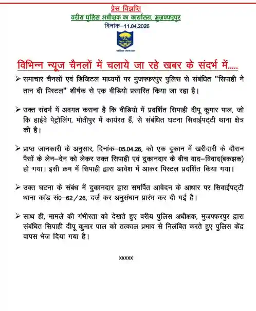 वरीय पुलिस अधीक्षक कांतेश कुमार मिश्रा ने साफ किया कि कानून से ऊपर कोई नहीं है चाहे वह वर्दी में हो या बिना वर्दी के। इस पूरे मामले ने एक बार फिर यह सवाल खड़ा कर दिया है कि आखिर छोटी-छोटी बातों पर कानून के रखवाले ही अगर गन कल्चर दिखाने लगें, तो आम आदमी किस पर भरोसा करे? मुजफ्फरपुर की ये घटना अब सिर्फ एक वायरल वीडियो नहीं, बल्कि वर्दी के दाग की एक बड़ी मिसाल बन चुकी है, जहां चार रुपये की लड़ाई ने पूरे सिस्टम की साख पर सवाल खड़े कर दिए हैं।