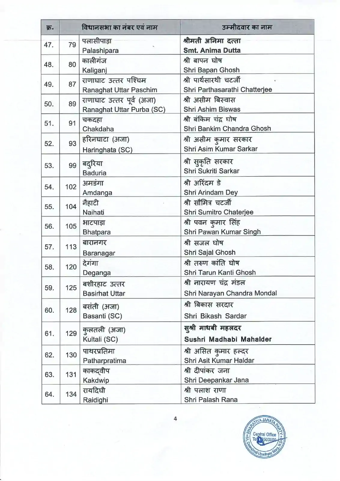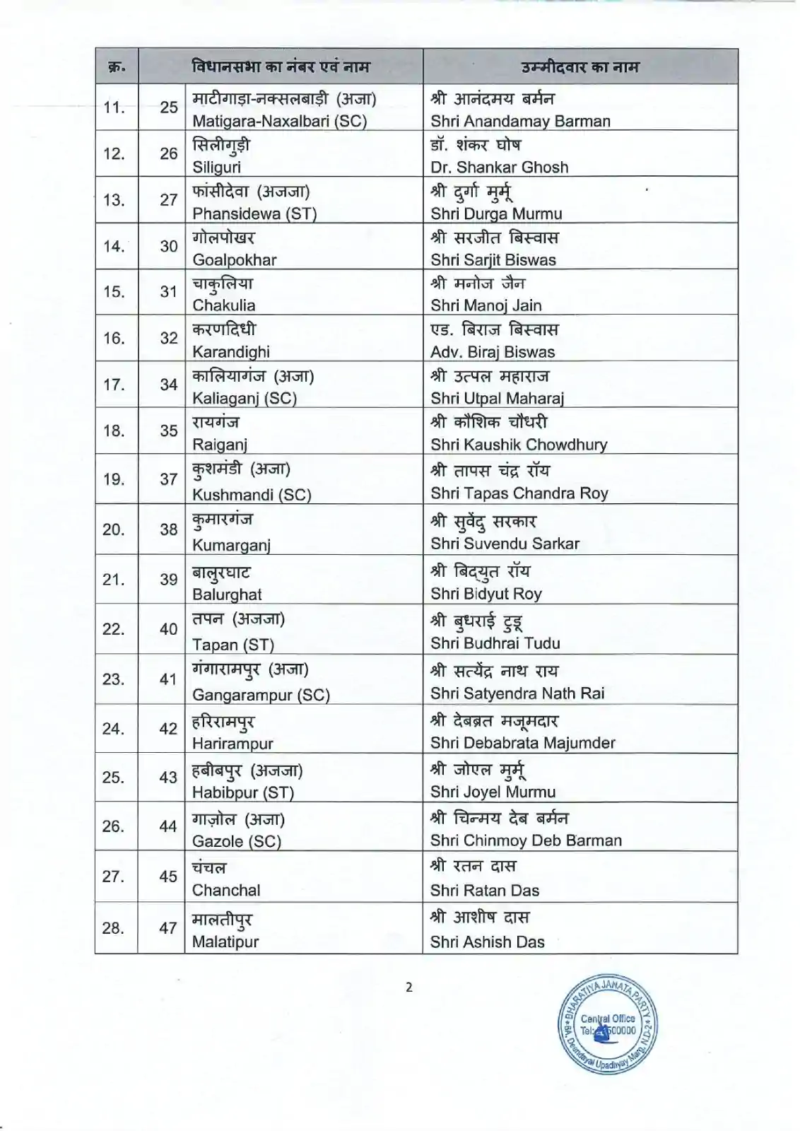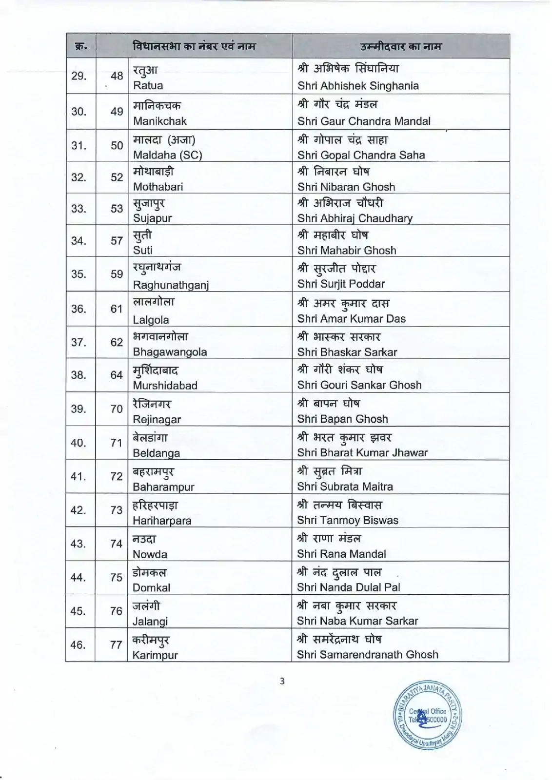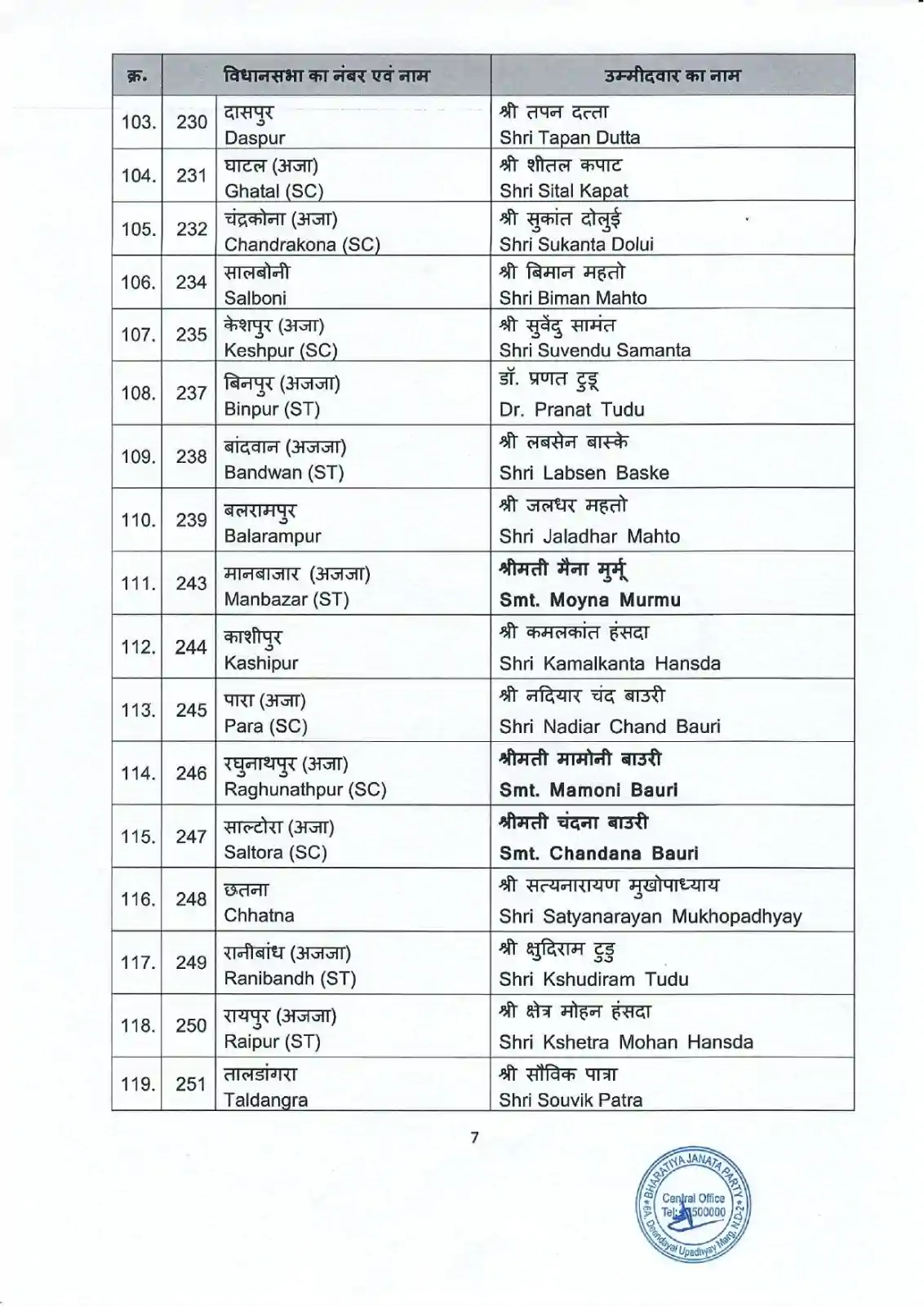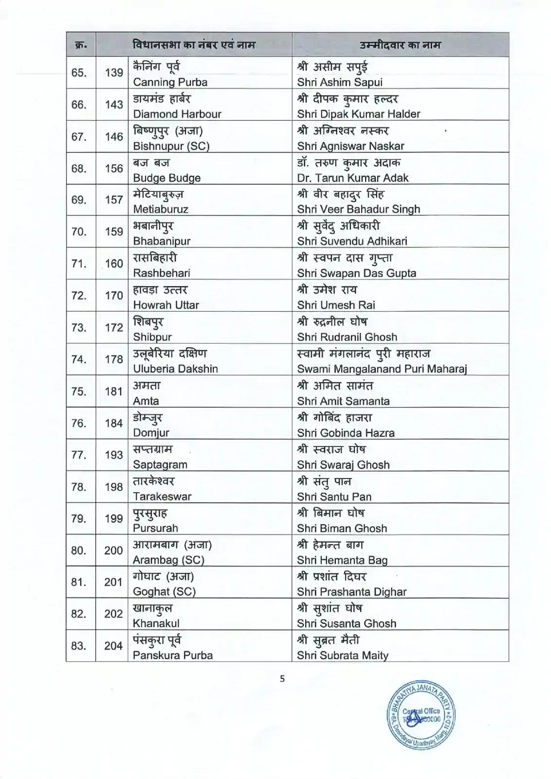 भवानीपुर: सुवेंदु अधिकारी (नोट: सुवेंदु अधिकारी का नाम सूची में नंदीग्राम और भवानीपुर दोनों प्रमुख संदर्भों में महत्वपूर्ण भूमिका में है)।