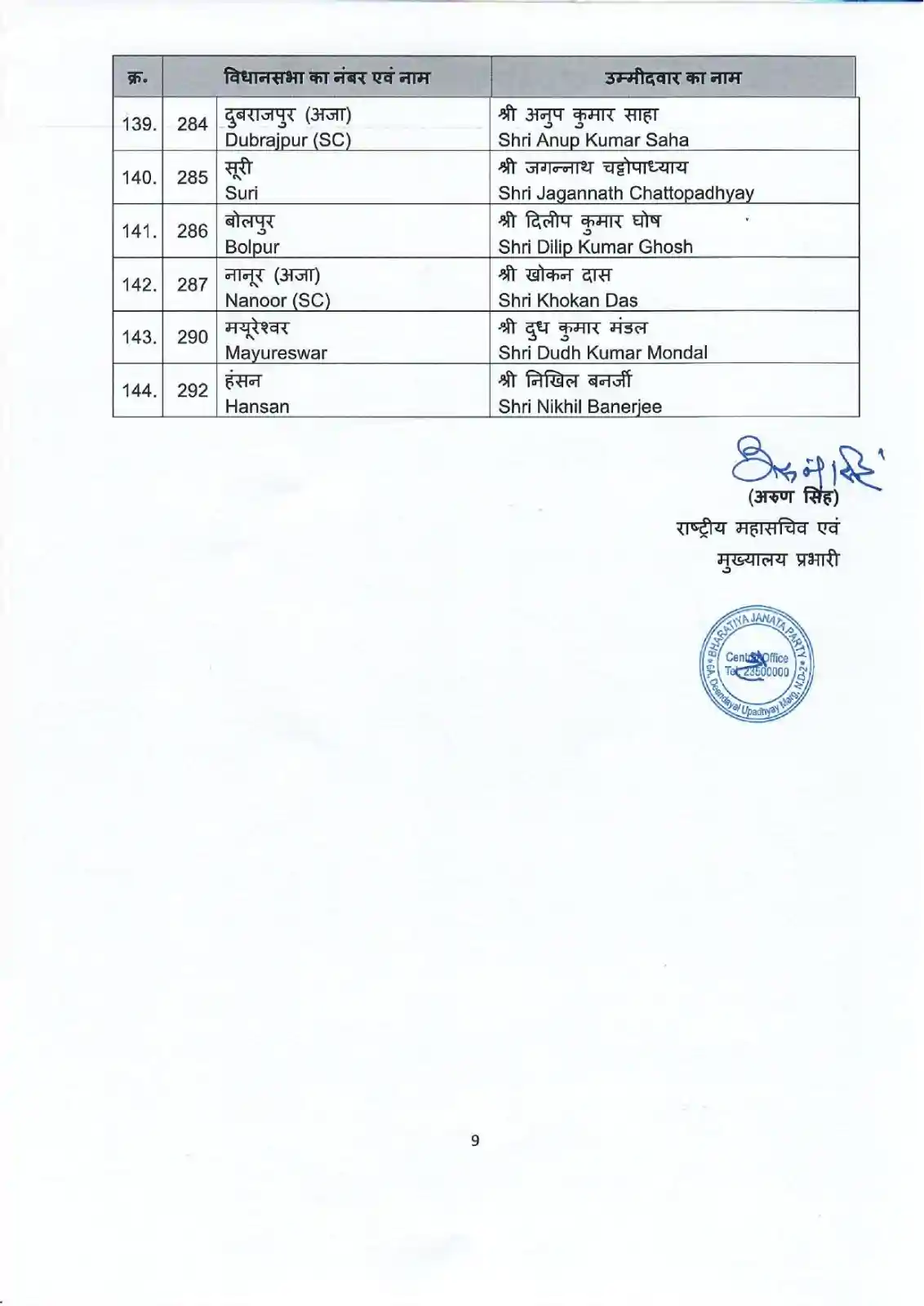 सांगठनिक मुहर: सूची पर राष्ट्रीय महासचिव एवं मुख्यालय प्रभारी अरुण सिंह के हस्ताक्षर हैं, जो पार्टी की एकजुटता और चुनावी तैयारी को दर्शाते हैं।
