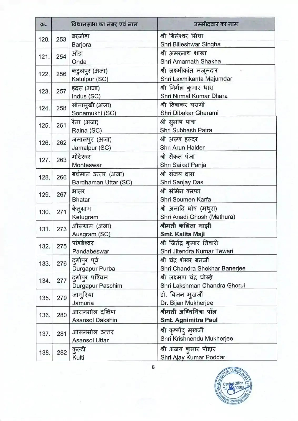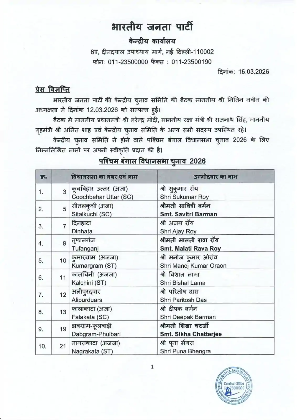 यह सूची पार्टी की केन्द्रीय चुनाव समिति की बैठक के बाद जारी की गई है, जिसकी अध्यक्षता नितिन नवीन ने की और इसमें प्रधानमंत्री नरेंद्र मोदी, गृह मंत्री अमित शाह और रक्षा मंत्री राजनाथ सिंह जैसे दिग्गज नेता शामिल रहे।
