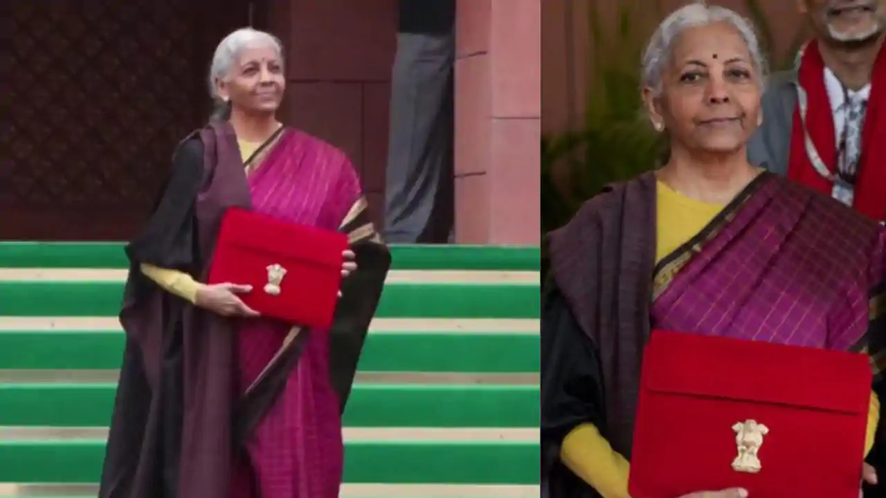 Budget Session 2026:वित्त मंत्री की साड़ी में हल्के सुनहरे-भूरे चेक वाला बैंगनी कट्टम (चेक वाला) बॉडी, धागे के काम वाला कॉफी-ब्राउन बॉर्डर और वायलेट और सुनहरे बॉर्डर से सजा हुआ मस्टर्ड-गोल्ड पल्लू पैनल था।
