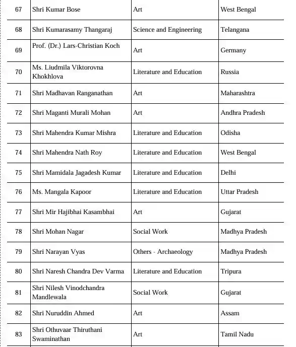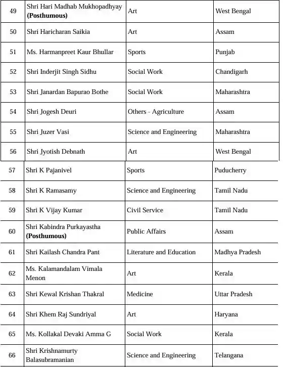 पद्म विभूषण जिन पांच लोगों को दिया गया है। उनमें फिल्म अभिनेता धर्मेंद्र के साथ सुप्रीम कोर्ट के पूर्व न्यायाधीश केटी थॉमस, वायलिन वादक एन राजन, साहित्य और शिक्षा के क्षेत्र से जुड़े पी नारायणन और केरल के पूर्व मुख्यमंत्री वीएस अच्युतानंदन शामिल हैं। पद्म भूषण से सम्मानित होने वालों में कला, चिकित्सा, लोक कार्य, सामाजिक कार्य, व्यापार और खेल जगत की प्रतिष्ठित 13 हस्तियां शामिल हैं। इनमें प्रमुख नाम अल्का याज्ञनिक- कला (महाराष्ट्र), भगत सिंह कोश्यारी- लोक कार्य (उत्तराखंड), डॉ. कालीपट्टी रामासामी पलानीस्वामी- चिकित्सा (तमिलनाडु), मम्मूटी- कला (केरल), डॉ. नोरी दत्तात्रेयुडु- चिकित्सा (संयुक्त राज्य अमेरिका), पीयूष पांडे (मरणोपरांत)- कला (महाराष्ट्र), एस. के. एम. माइलानंदन- सामाजिक कार्य (तमिलनाडु), शतावधानी आर. गणेश- कला (कर्नाटक), शिबू सोरेन (मरणोपरांत)- लोक कार्य (झारखंड), उदय कोटक-व्यापार एवं उद्योग (महाराष्ट्र), वी. के. मल्होत्रा (मरणोपरांत)- लोक कार्य (दिल्ली), वेल्लापल्ली नटेशन- लोक कार्य (केरल) और विजय अमृतराज- खेल (संयुक्त राज्य अमेरिका) शामिल हैं।