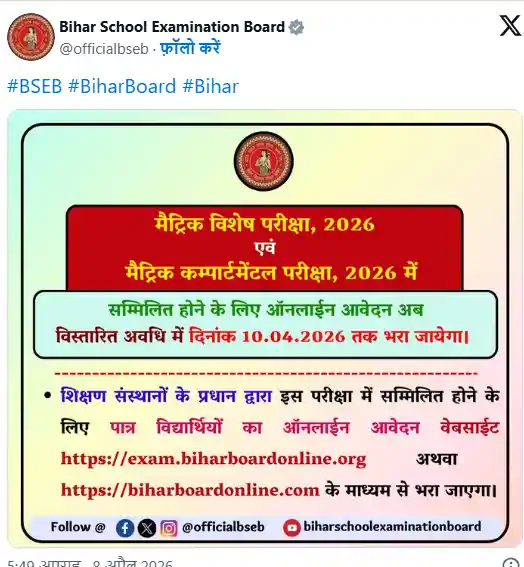 Bihar 10th Compartment Exam 2026: बिहार के शिक्षा व्यवस्था में छात्रों के लिए राहत का संकेत मिला है। बिहार स्कूल परीक्षा बोर्ड (Bihar School Examination Board) ने कक्षा 10वीं की विशेष और कंपार्टमेंट परीक्षाओं 2026 के लिए आवेदन की आखिरी तिथि को फिर से बढ़ा दिया है। अब इच्छुक और पात्र छात्र 10 अप्रैल 2026 तक बीएसईबी की आधिकारिक वेबसाइट biharboardonline.bihar.gov.in के माध्यम से आवेदन कर सकते हैं। इससे पहले बोर्ड ने आवेदन की अंतिम तारीख 7 अप्रैल तय की थी।