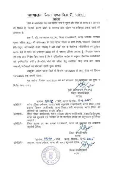 पटना जिलाधिकारी ने अपने आधिकारिक नोटिफिकेशन के साथ-साथ सोशल मीडिया पर भी संदेश जारी करते हुए कहा कि कड़कड़ाती ठंड और गिरते तापमान को देखते हुए बच्चों की सुरक्षा सर्वोपरि है। इसी कारण 8वीं तक की शैक्षणिक गतिविधियाँ निर्धारित समय के भीतर ही संचालित की जाएंगी।"यह आदेश अगले एक सप्ताह तक प्रभावी रहेगा, जिसे मौसम की स्थिति को देखते हुए आगे बढ़ाया भी जा सकता है।