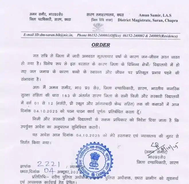 सारण जिलाधिकारी द्वारा जारी आदेश में कहा गया है कि प्राकृतिक आपदा के कारण छोटे बच्चों का स्कूल तक आना-जाना मुश्किल और जोखिम भरा हो सकता है। लगातार हो रही मूसलाधार बारिश के चलते कई मार्गों पर जलभराव की स्थिति बन चुकी है, जिससे सड़क हादसों का खतरा बढ़ जाता है। प्रशासन ने अभिभावकों से अपील की है कि वे अपने बच्चों की सुरक्षा के प्रति सचेत रहें और उन्हें केवल अत्यावश्यक स्थिति में ही घर से बाहर निकलने दें।