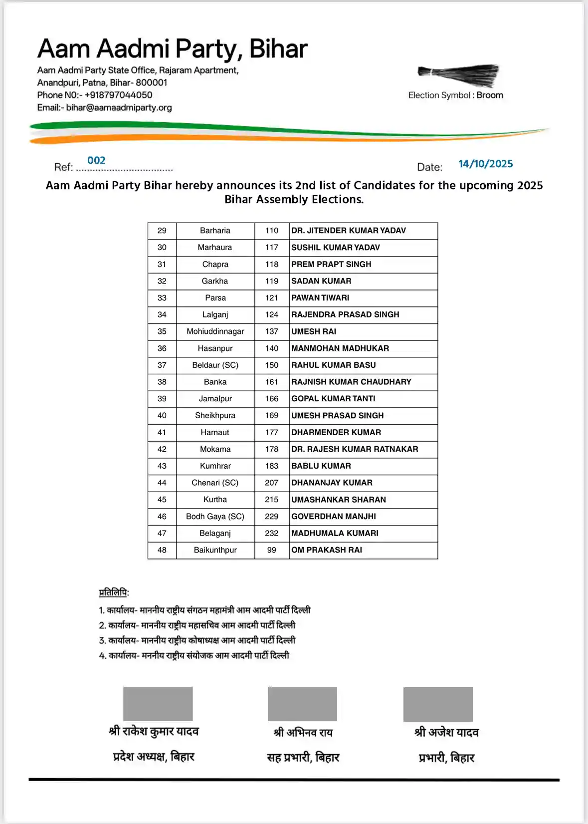सह प्रभारी अभिनव राय ने कहा कि यह सिर्फ चुनाव नहीं, बल्कि एक आंदोलन है कि बिहार बदलेगा, अब आम आदमी चलेगा। उन्होंने कहा कि पार्टी चाहती है कि राजनीति में आम लोग आगे आएं। ऐसे लोग जो जनता की तकलीफ को समझते हों। बिहार में विकास तभी संभव है, जब राजनीति ईमानदारी और जवाबदेही के रास्ते पर चले। आम आदमी पार्टी की दूसरी सूची जारी होने के साथ ही बिहार की सियासत में नई हलचल तेज हो गई है। पार्टी अब खुद को पारंपरिक राजनीति के विकल्प के रूप में पेश कर रही है और ईमानदार शासन के वादे के साथ मैदान में उतर चुकी है।