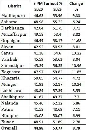 बिहार विधनसभा चुनाव 2025 में बंपर वोटिंग हो रही है। इस बार वोटिंग प्रतिशत 2020 विधानसभा चुनाव के तीनों फेस से अधिक है। 2020 विधानसभा चुनाव में दोपहर 3 बजे तक पहले फेज में 44.98 फीसदी मतदान हुआ था।