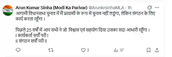 Bihar Vidhansabha Chunav 2025: पटना जिले की कुम्हरार विधानसभा सीट से बीजेपी के विधायक रहे अरुण कुमार सिन्हा इस बार चुनाव मैदान में नहीं उतरेंगे। लंबे समय तक पार्टी और क्षेत्र की सेवा करने वाले अरुण सिन्हा ने सोमवार (13 अक्टूबर, 2025) को स्वयं सोशल मीडिया पर घोषणा की कि वे आगामी विधानसभा चुनाव में प्रत्याशी नहीं बनेंगे, लेकिन संगठन के लिए सक्रिय रहेंगे। उन्होंने लिखा, “पिछले 25 वर्षों में आप सभी ने जो विश्वास एवं सहयोग दिया उसका सदा आभारी रहूंगा. कार्यकर्ता सर्वो परी, संगठन सर्वो परी।”
