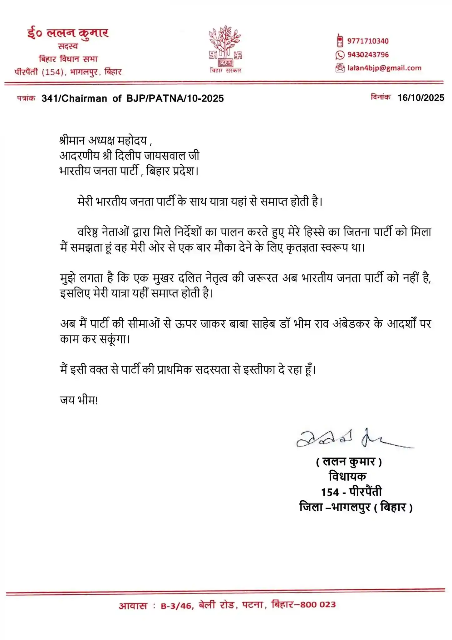 प्रदेश अध्यक्ष दिलीप जायसवाल को लिखी चिठ्ठी में ललन कुमार ने लिखा है कि, "मेरी भारतीय जनता पार्टी के साथ यात्रा यहां से समाप्त होती है। पार्टी को वरिष्ठ नेताओं द्वारा मिले निर्देशों का पालन करते हुए मेरे हिस्से का जितना पार्टी को मिला मैं समझता हूं वह मेरी ओर से एक बार मौका देने के लिए कृतज्ञता स्वरूप था। मुझे लगता है कि एक मुखर दलित नेतृत्व की जरूरत अब भारतीय जनता पार्टी को नहीं है, इसलिए मेरी यात्रा यहीं समाप्त होती है। अब मैं पार्टी की सीमाओं से ऊपर जाकर बाबा साहेब डॉ भीम राव अंबेडकर के आदर्शों पर काम कर सकूंगा। मैं इसी वक्त से पार्टी की प्राथमिक सदस्यता से इस्तीफा दे रहा हूं"।