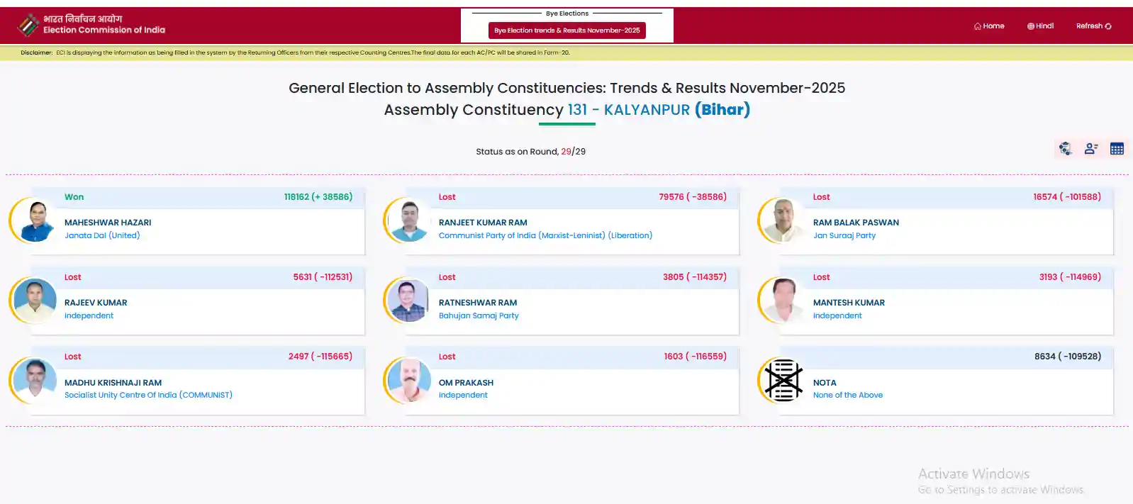 Bihar Election Counting: बिहार विधानसभा चुनाव के नतीजे सामने आने लगे हैं। सबसे पहले सीएम नीतीश के 2 मंत्रियों के सीट का नतीजा चुनाव आयोग ने घोषित किया है। चुनाव आयोग ने कल्याणपुर विधानसभा सीट के नतीजे की घोषणा कर दी है। यहां से सीएम नीतीश के मंत्री महेश्वर हजारी की जीत हुई है। चुनाव आयोग ने उनकी जीत की घोषणा कर दी है। महेश्वर हजारी 38588 सीट से जीते हैं। महेश्वर हजारी ने सीपीएमएल एल प्रत्याशी रणजीत कुमार राम को 38586 से हराए हैं।