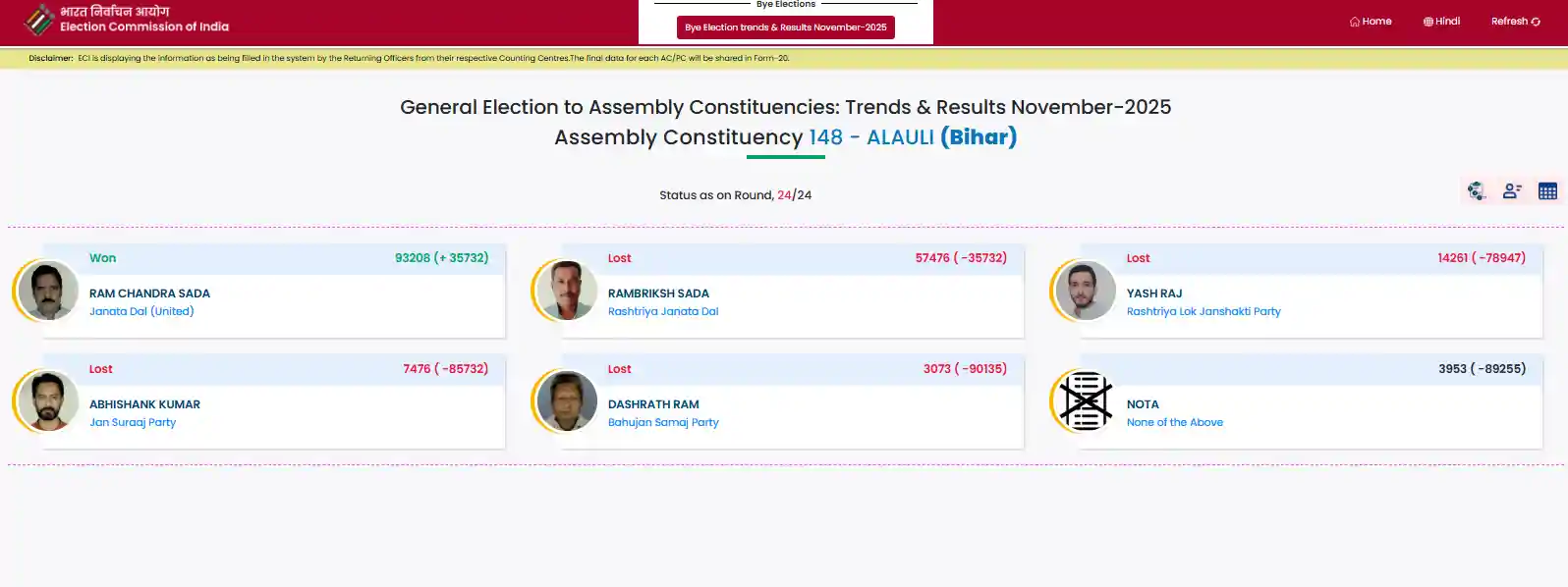 इसके साथ ही सीएम नीतीश के दूसरे मंत्री की भी जीत हो गई है। अलौली से सीएम नीतीश के मंत्री रामचंद्रा सादा की जीत हो गई है। रामचंद्रा सादा ने 35733 मतों से जीत हासिल कर ली है। रामचंद्रा सादा ने राजद प्रत्याशी राम विकास सादा को 35732 मतों से हरा दिया है।