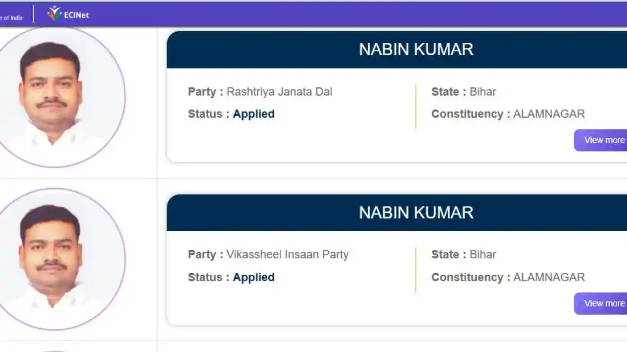 मामला आलमनगर विधानसभा सीट से जुड़ा है। जहां नवीन कुमार नाम के उम्मीदवार ने दो अलग-अलग राजनीतिक दलों वीआईपी और आरजेडी दोनों के सिंबल पर नामांकन दाखिल किया है। सूत्रों के मुताबिक, इलेक्शन कमीशन की वेबसाइट पर अपलोडेड दस्तावेज़ों में यह मामला स्पष्ट रूप से दिखाई दे रहा है, जिसमें नवीन कुमार का नाम दोनों दलों के प्रत्याशी के रूप में दर्ज है।